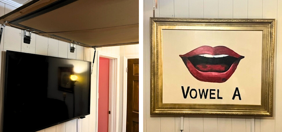 You can, of course, cover your television with anything that’s flat and bigger than your TV at its widest measurement — like a map, a canvas with your wedding photo on it, a mirror, et cetera. Because my husband and I decorated our TV room with Old Hollywood and vintage TV memorabilia, I wanted our hidden TV to keep with that interior design and match the rest of our home. That’s how I decided to recreate the poster displaying the words “Vowel A” from the movie Singin’ In the Rain.