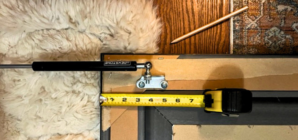 After securing the hinges, I used similar screws to attach the gas struts on either side of the frame. Your struts should come with specific instructions. The ones I used needed to be affixed 4.5 inches from the top of the frame with the black side toward the frame.