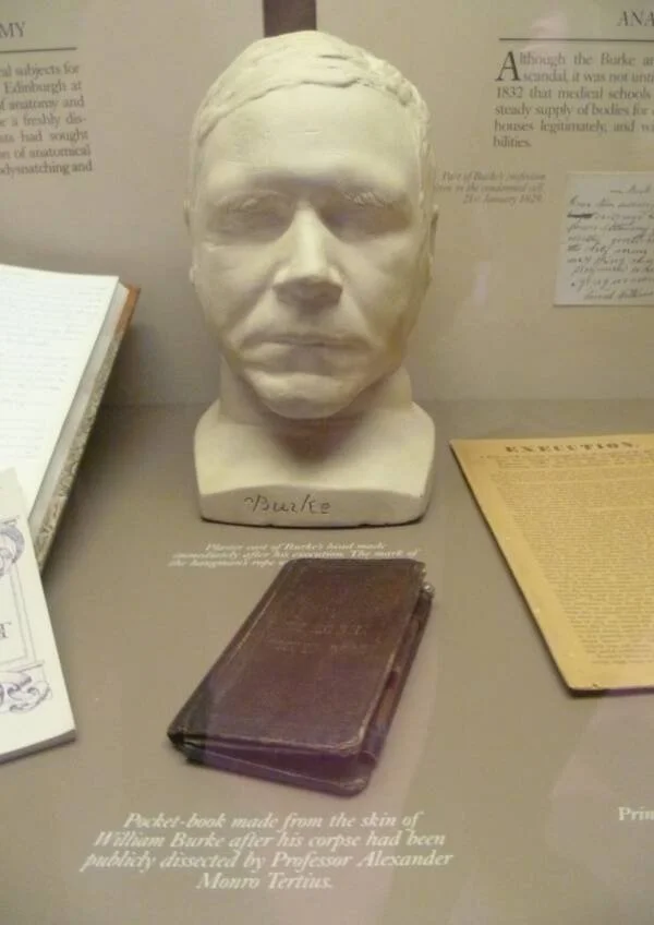 Death Mask of William Burke; Pocket-book made from the skin of William Burke after his corpse had been publicly dissected by Professor Alexander Monro Tertius. Display at the Surgeons’ Hall Museum in Edinburgh, Scotland, UK.